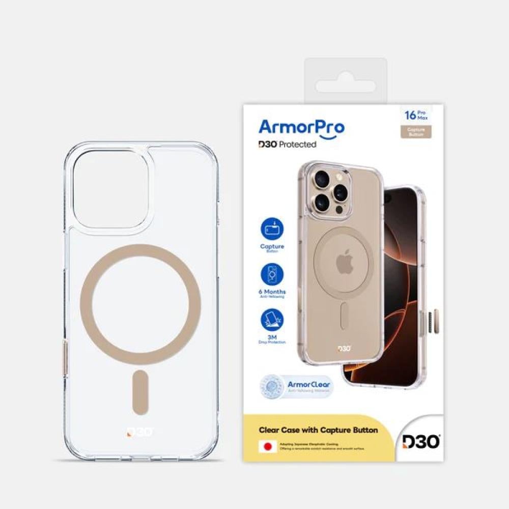 يقدّم غطاء الحماية ArmorPro D3O Protected TPU+PC Gold MagSafe Clear Case with Capture Button AI لجهاز iPhone 16 Pro حماية فائقة بفضل دمج تقنية D3O الممتصة للصدمات مع تصميم شفاف يُظهر أناقة الهاتف ولمسات ذهبية فاخرة. يدعم الغطاء تقنية MagSafe للشحن اللاسلكي وتثبيت الملحقات المغناطيسية، كما يضم زر Capture Button AI لالتقاط الصور والفيديوهات بسهولة وذكاء.