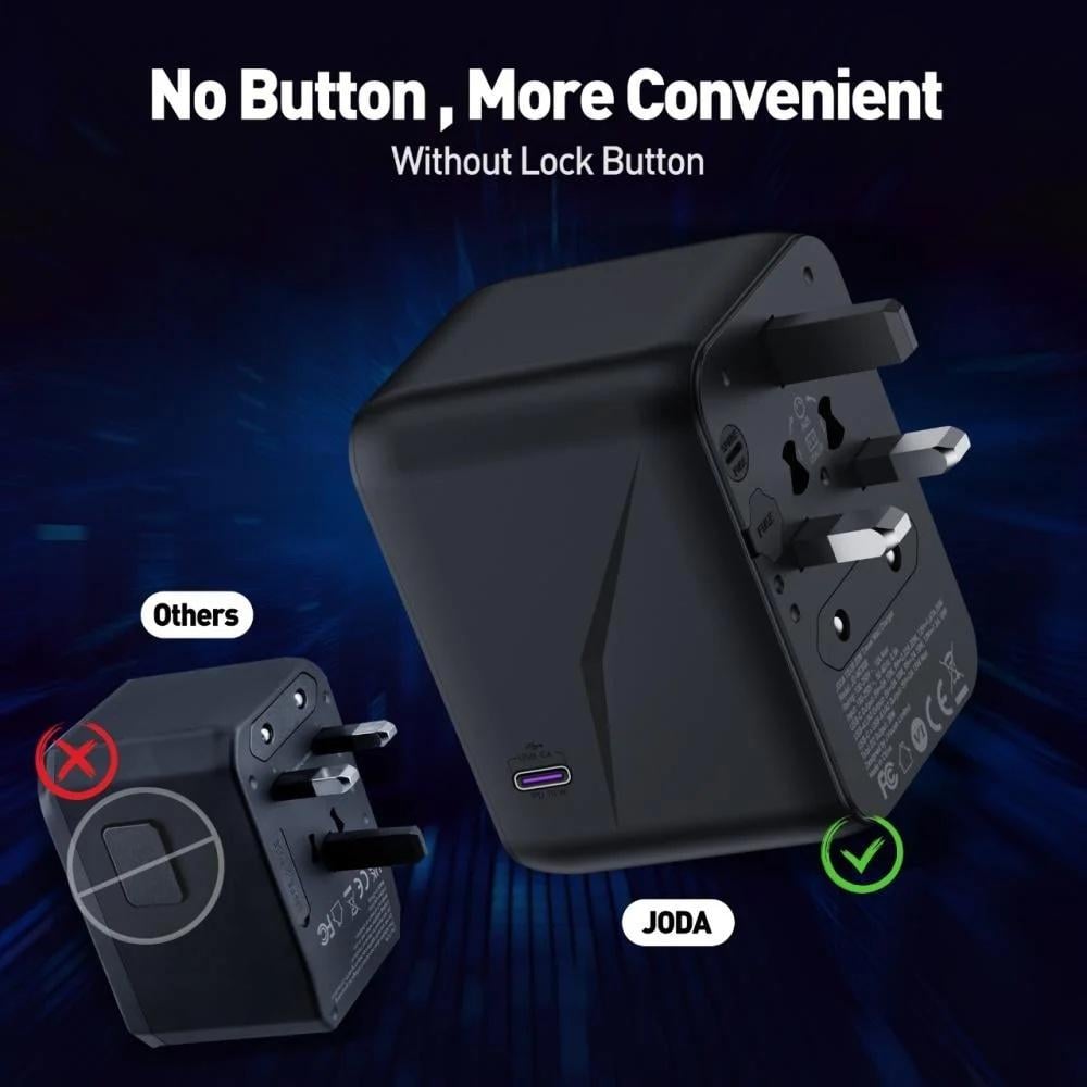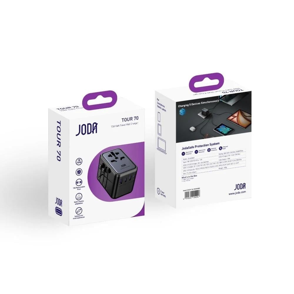 يقدم شاحن السفر جودا تور 70 (JODA TOUR 70) بقدرة 70 واط والمزوّد بتقنية GaN (Gallium Nitride) تجربة شحن فائقة السرعة والكفاءة لأجهزتك المتعددة. يأتي بتصميم مدمج ولون أسود أنيق، ما يجعله مثاليًا للاستخدام أثناء السفر أو في المنزل والمكتب. بفضل تقنية GaN المتطورة، يوفّر هذا الشاحن أداءً عالياً مع تقليل الحرارة والحجم، إلى جانب دعم شحن عدة أجهزة في وقت واحد.