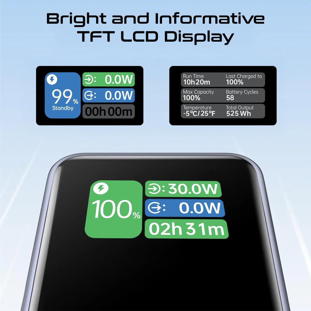 ابقَ على اطلاع دائم بحالة البطارية ومستويات الطاقة بفضل شاشة TFT LCD الملونة، التي تعرض معلومات الطاقة بشكل دقيق وواضح مع زر تحكم متعدد الوظائف لإدارة الطاقة بسهولة.