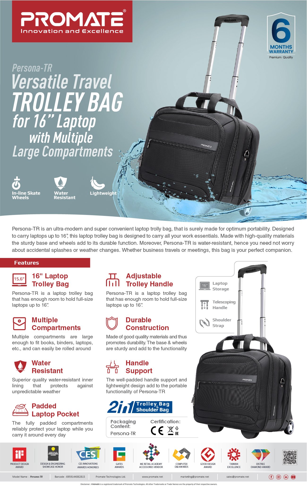 - عجلات قوية ومتينة: مثالية عند السفر أو الذهاب في عطلة، تتميز حقيبة عربة Promate Persona-TR بعجلات تزلج مدمجة، قوية ومتينة. يعد هذا مثاليًا للمسافرين الدائمين الذين يبحثون عن راحة الانزلاق حول حقيبتهم.