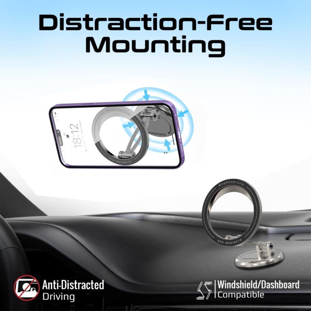 يوفر MagHoop-Lite تجربة تركيب سلسة وخالية من التشتيت، مما يسمح لك بالتركيز كليًا على المهمة التي تقوم بها. تضمن آلية التثبيت الآمنة ثباتًا على كل من أسطح الزجاج الأمامي ولوحة القيادة، مما يلغي أي تشتيت محتمل ناتج عن حامل غير ثابت أو غير مستقر. استمتع براحة البال مع العلم أن جهازك مثبت بشكل آمن، مما يترك لك حرية التركيز على القيادة بأمان.