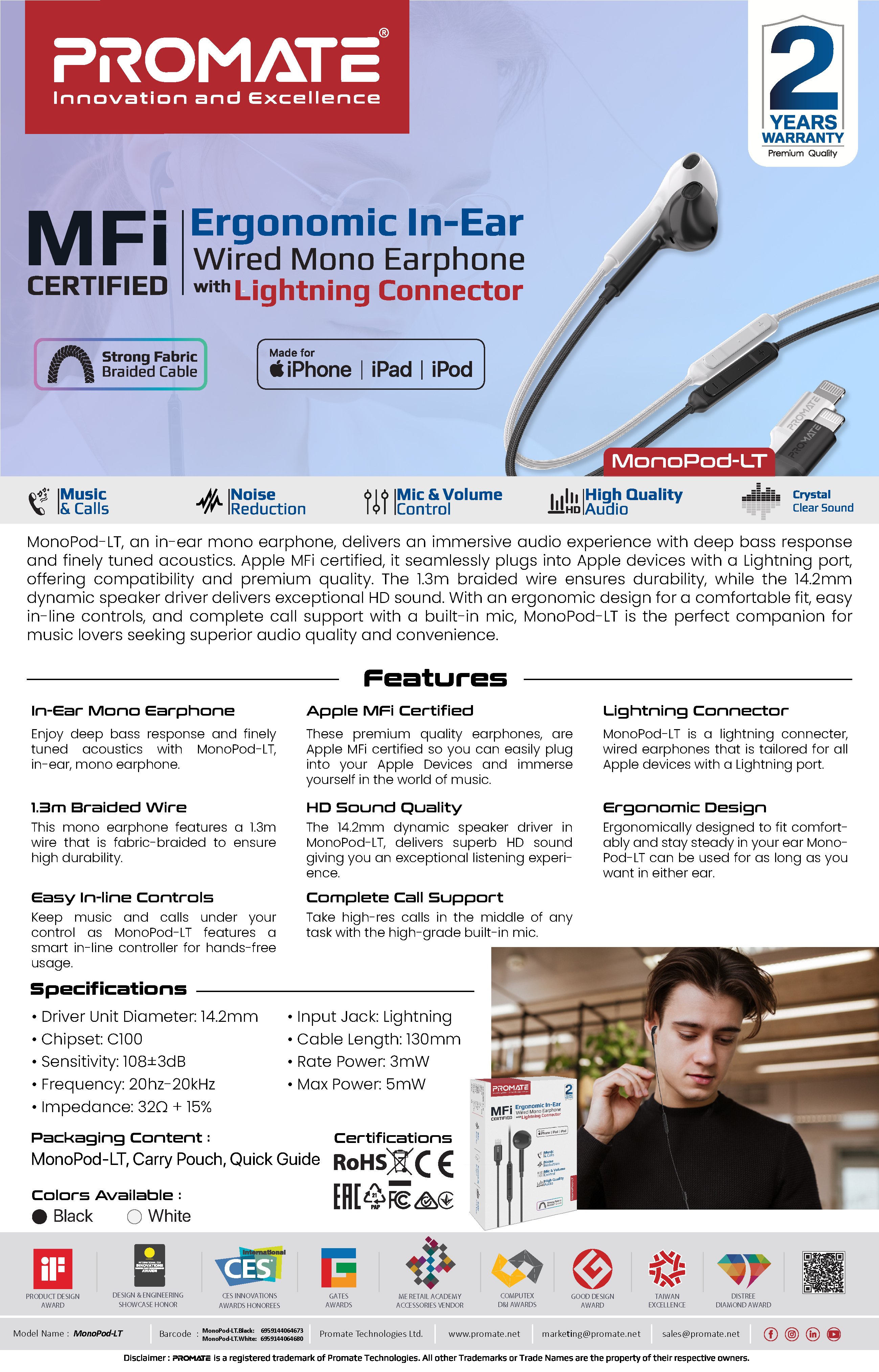 توفر سماعة MonoPod-LT، وهي سماعة أذن أحادية توضع داخل الأذن، تجربة صوتية غامرة مع استجابة جهير عميقة وصوتيات مضبوطة بدقة. معتمد من Apple MFi، ويتم توصيله بسلاسة بأجهزة Apple المزودة بمنفذ Lightning، مما يوفر التوافق والجودة المتميزة. يضمن السلك المضفر بطول 1.3 مترًا المتانة، بينما يوفر برنامج تشغيل السماعة الديناميكي مقاس 14.2 ملم صوتًا عالي الدقة استثنائيًا. بفضل التصميم المريح لملاءمة مريحة، وأدوات تحكم سهلة في الخط، ودعم كامل للمكالمات باستخدام ميكروفون مدمج، يعد MonoPod-LT الرفيق المثالي لمحبي الموسيقى الذين يبحثون عن جودة صوت وراحة فائقة.