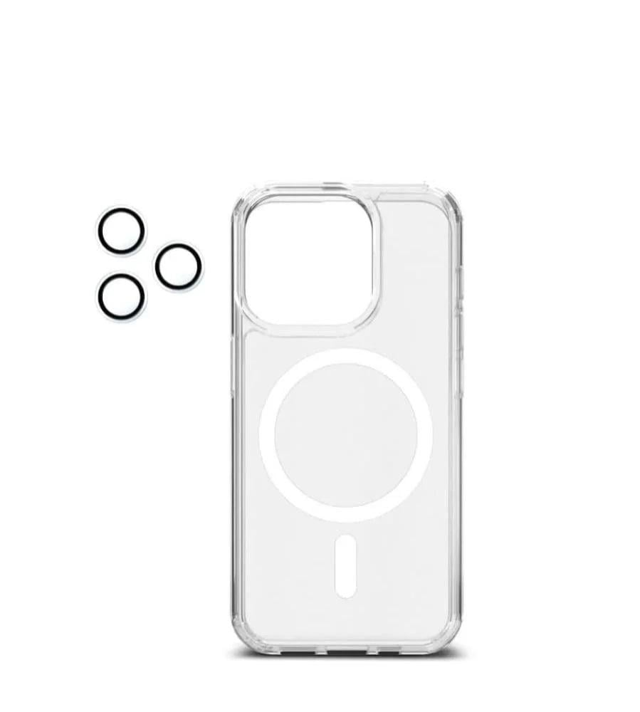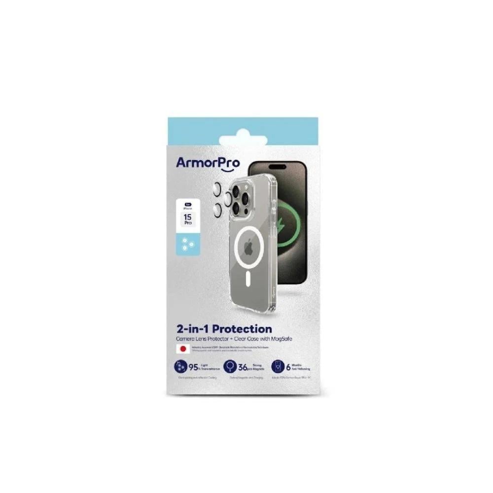 يقدّم لك ArmorPro 2-in-1 Combo لجهاز iPhone 15 Pro Max حماية شاملة تجمع بين كفر شفاف يدعم تقنية MagSafe وواقي عدسة كاميرا شفاف. يحافظ هذا الحل المتكامل على المظهر الأنيق للهاتف، ويوفّر في الوقت نفسه حماية موثوقة للهيكل والعدسات من الصدمات والخدوش، مع دعم الشحن اللاسلكي المغناطيسي بسهولة.